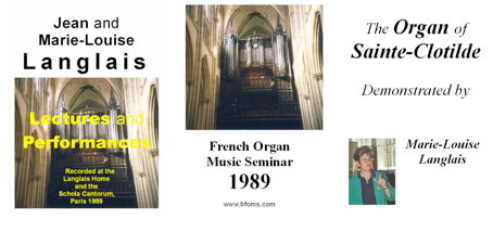 Produced in 1993, this DVD features Marie-Louise Langlais at the console of Sainte-Clotilde Basilica in paris, explaining and describing the organ. During this session 1989 of the French Organ Music Seminar, She gives lessons at Sainte-Clotilde on Franck, Tournemire and Langlais.